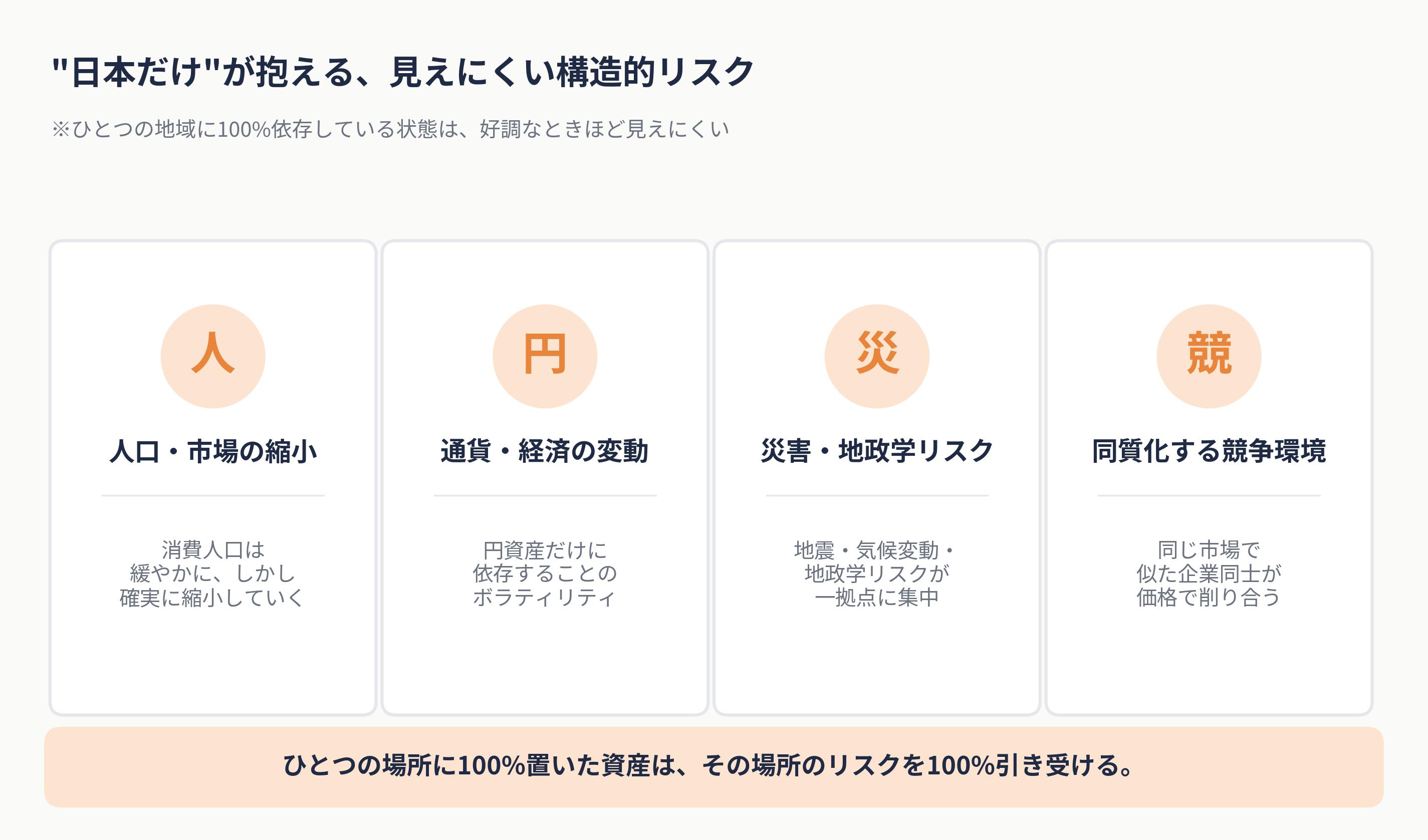 これは”日本がダメ”ではなく、”ひとつの場所に全部置いていることのリスク”を見ている発想です。