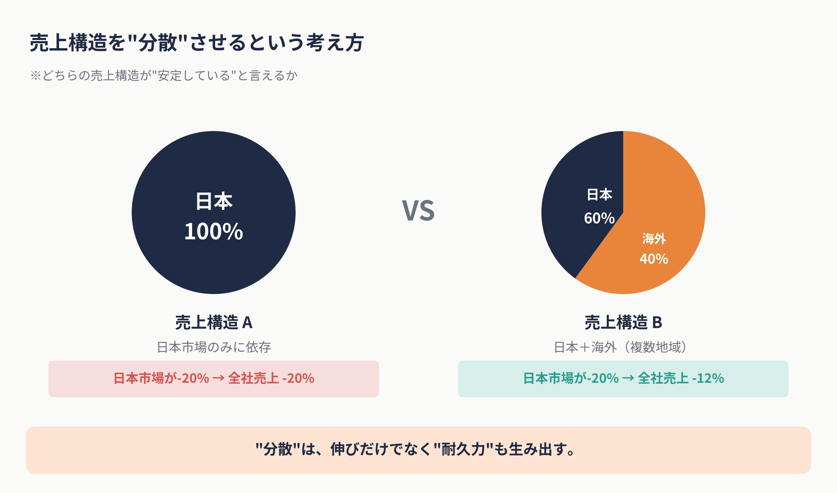 例えば、売上構造が日本100%の会社と、日本60%+海外40%の会社。