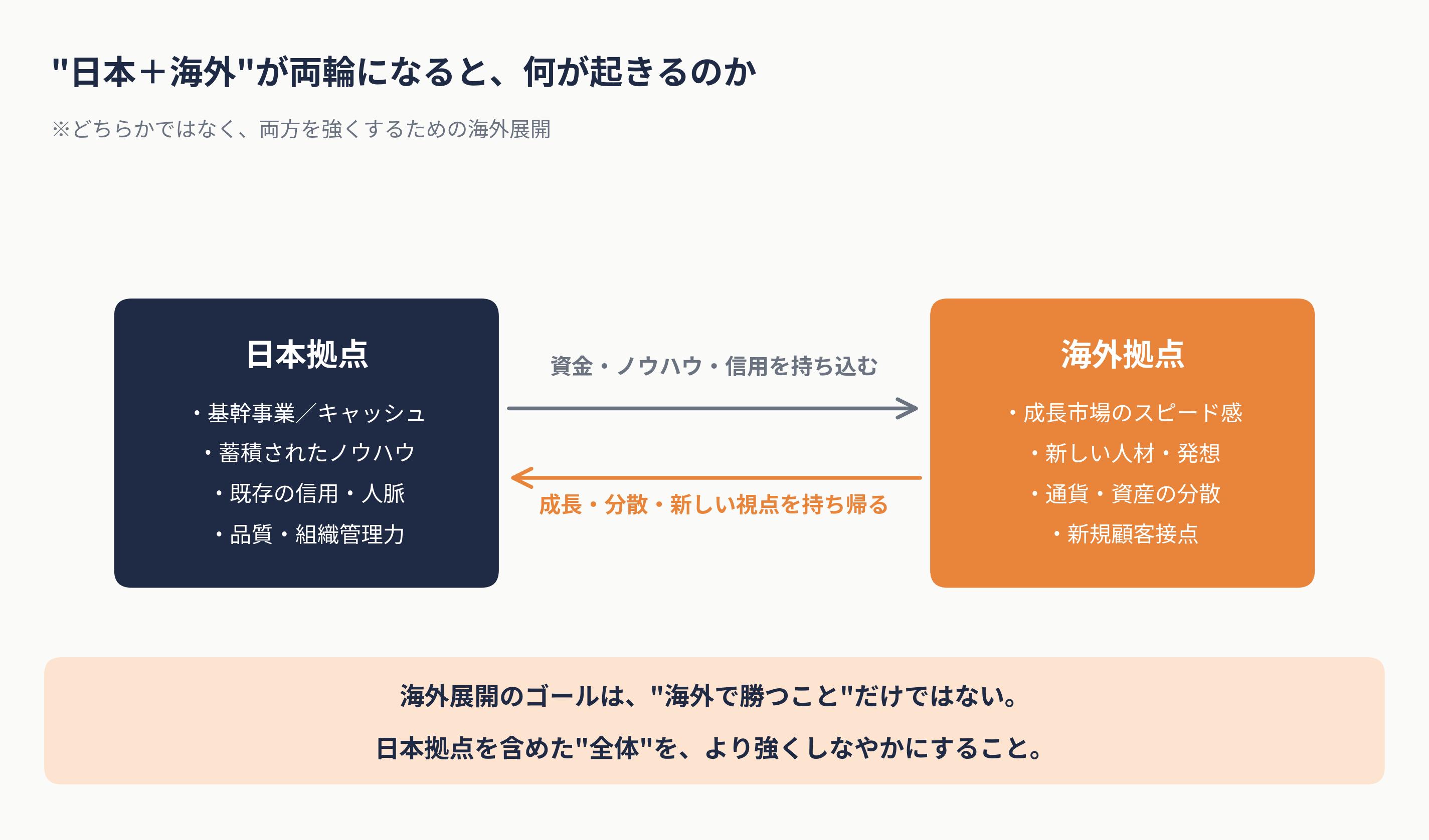 この思考で出る経営者は、日本事業を縮小しません。 むしろ、日本事業を強化しながら、横にもう一本の柱を立てに行きます。